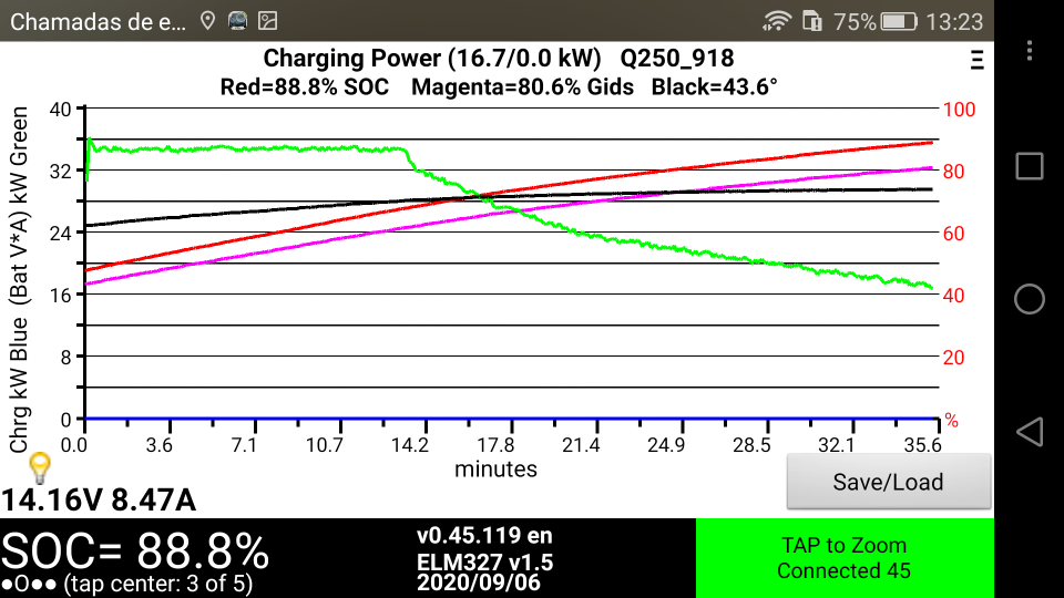 Durante uma parte do percurso a autonomia estimada andou bastante próxima da distância que faltava, mas era sobretudo uma questão de altitude. Na parte final a média de consumo desceu e cheguei com cerca de 14% e uma média de 11,3kWh/100km.