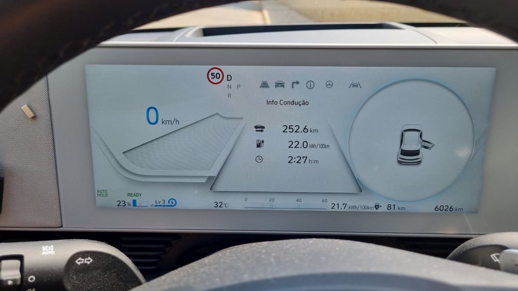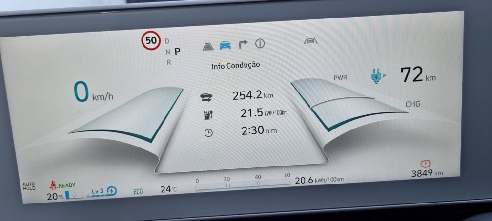 Depois de 4 meses e 4000kms as médias em cidade andam pelo 13kWh/100kms (média 30kms/h) e a 120kms/h pelos 21kWh/100kms, fui de Almada a Vilamoura e cheguei com 28% da bateria (eco, HDA2 e cruise control a 120KMs/h 22ºC) para cima carreguei na véspera e devo ter feito 30kms antes do regresso cheguei com 20% (30ºC)