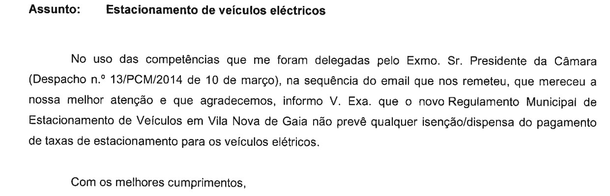 Como nunca vi qualquer evidência dessa isenção e depois de verificar que o regulamento do estacionamento não fazia qualquer referência aos VE, questionei a CMG.
