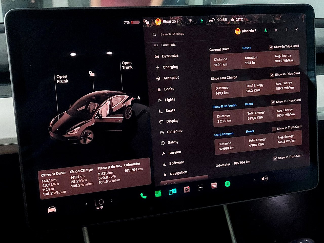 Primeiro carregamento em Mérida após viagem com paragem em Montemor para um pequeno almoço, previsão de 26% na APP mas o carro chega com 12%. Não é difícil de perceber, a mala vai cheia, a frunk ainda mais, no lugar do pendura vão duas mochilas aos pés, e entre as cadeiras dos miudos vai um saco e uma mochila no chão. O cabo de carregamento viaja por baixo do meu banco aos pés do mais velho, e o outro lado também vai com alguma tralha: Em resumo, o nosso Model 3 nunca viajou tão pesado, e a estimativa deve ter assumido as médias anteriores.