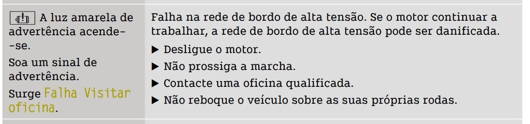 Hoje fiz cerca de 50kms com o carro e acendeu uma luz uma luz amarela de advertência. No manual de utilizador informa que " Falha na rede de bordo de alta tensão. Se o motor continuar a trabalhar, a rede de bordo de alta tensão pode ser danificada."