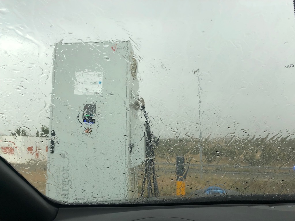 Enquanto falávamos do que poderia estar a causar o problema (culpado provável seria a temperatura, aqui já nos 46º) comecei a perceber que com o pessoal no carro a gastar A/C e sem saber se ia conseguir carregar mais alguma coisa, mais valia seguir viagem, diminuindo a velocidade para que os 96 Kms de autonomia estimada chegassem para os 77 Kms de percurso ainda pela frente…