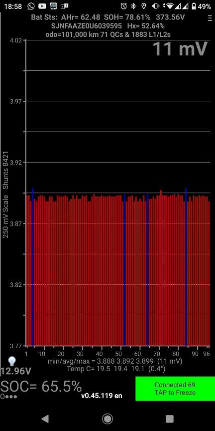 A 2ª barra de capacidade desapareceu. Exactamente 101000 km mostrando o leafSpy 78.61% SOH.