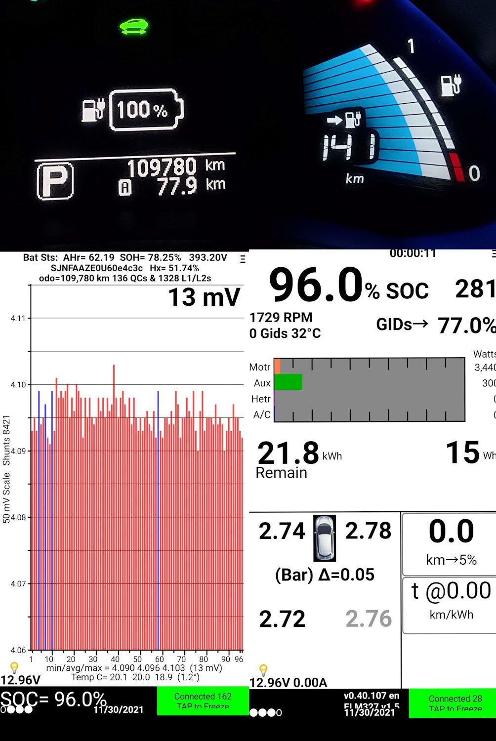 No meu diário de bordo estão alguns testes antes do update, onde gastava os 25kWh para carregar dos 0% aos 100% e com três barras perdidas (66% de SOH). Na realidade esses 25kWh necessários para carregar veio mostrar (depois do update) que o carro ainda conseguia armazenar 24kWh e tinha o SOH real de 82%.