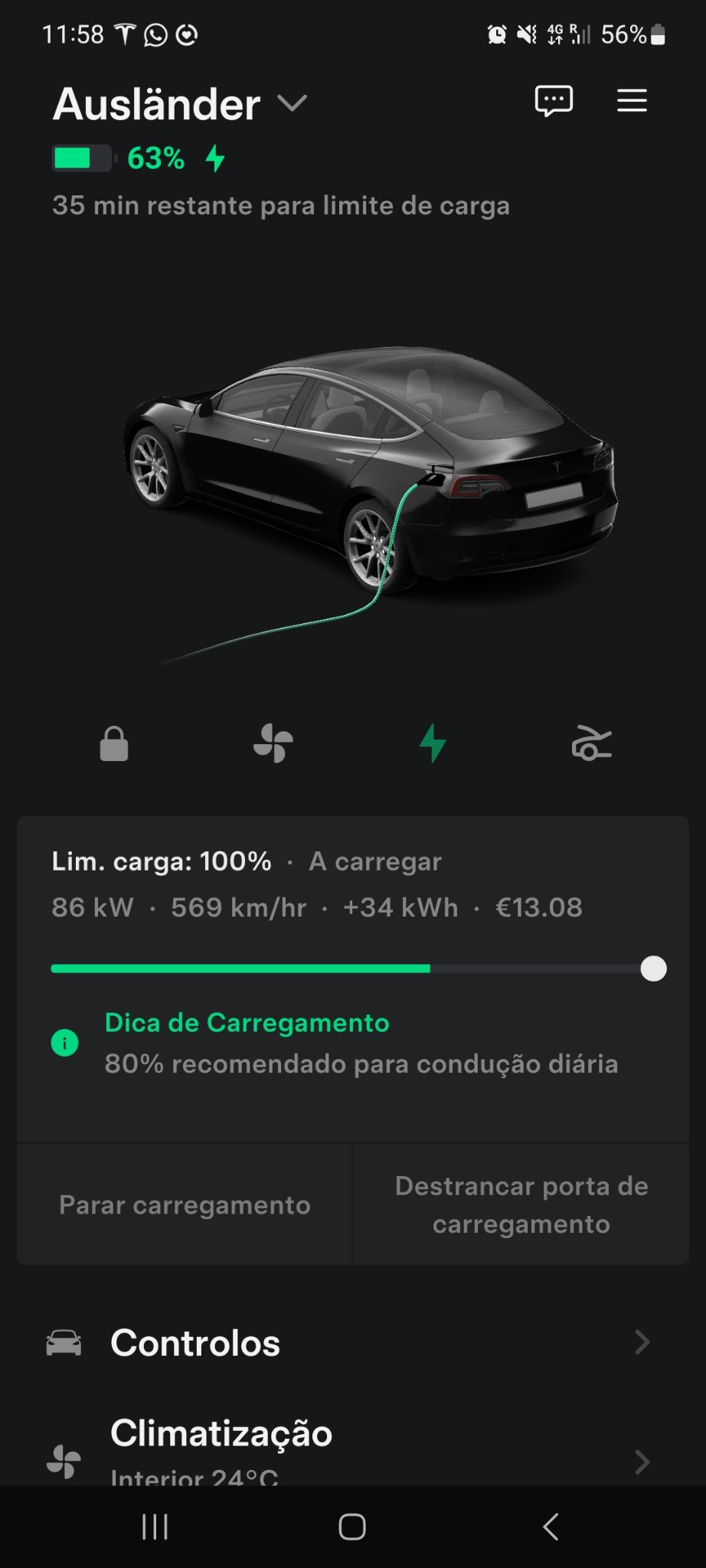 A simulação na aplicação Tesla é que vou chegar ao restaurante com 30%, embora acredite mais nos 25%.