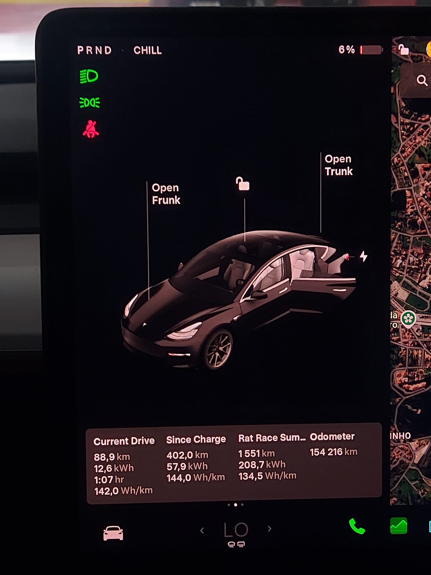 Alterações? Mais peso, mesmos ocupantes mas mala e frunk cheios, tampões colocados esta semana, e sempre autopilot ligado com a mesma velocidade fixa, mas com uma atitude mais activa: Aumentar a velocidade em descidas e reduzir nas subidas mais pronunciadas.