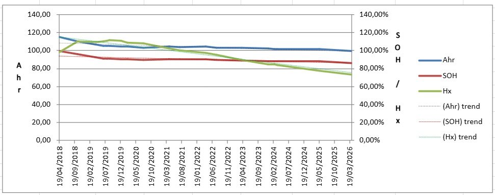 Portanto, 13,92% degradação em 8 anos dá uns belos 1,74% degradação/ano. Pelo gráfico o Ahr e o SOH estão mais ou menos planos enquanto o Hx continua a descer praticamente desde o primeiro ano e meio