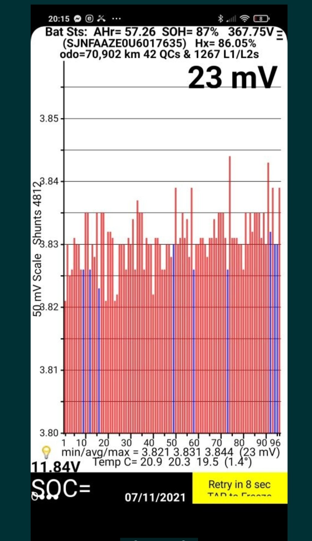 Se tem 11 barras essa imagem do leafspy não pertence a esse carro, ou então foi tirada a muito tempo. 11 barras = 85% de SOH essa imagem mostra 87%.