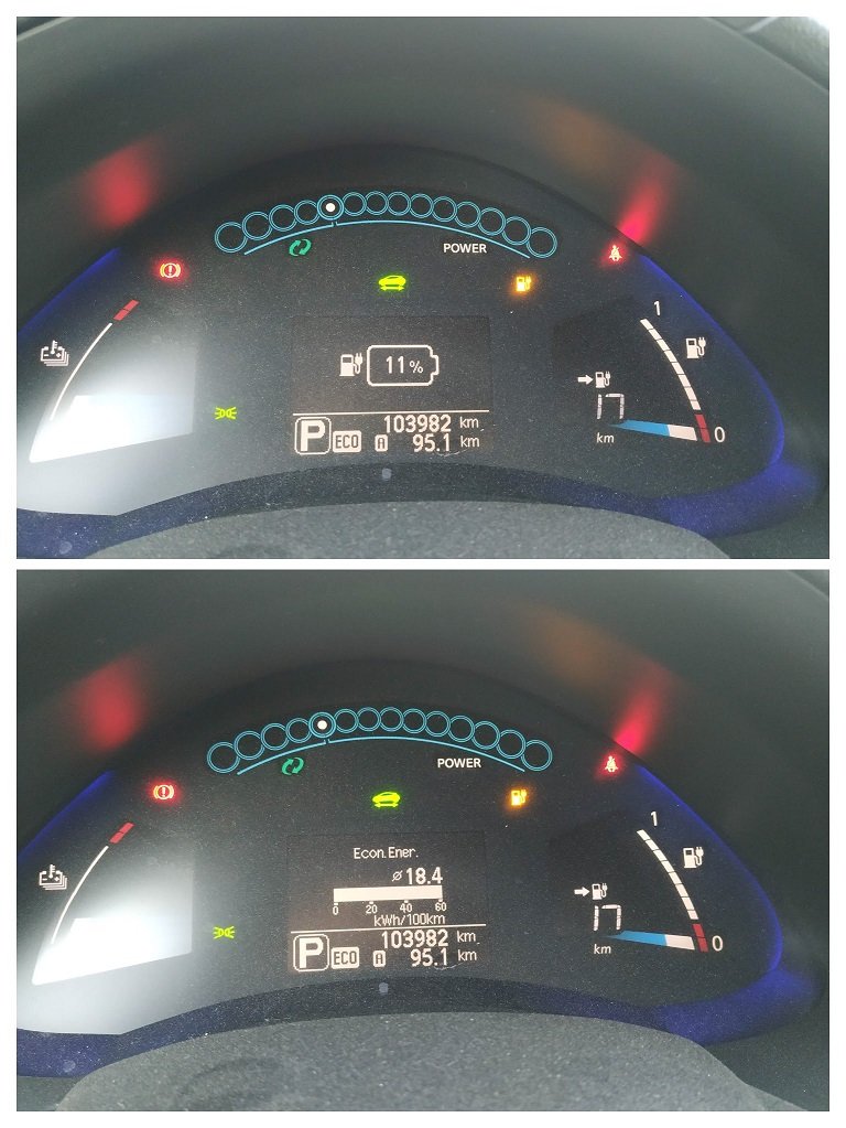 Resultado: 95 km percorridos, 11% bateria restante, 18.4 kWh/100km de consumo, ou seja, 20kWh é +- a energia que consigo usar da bateria com este frio! Isto é, 100km com alguma AE pelo meio.