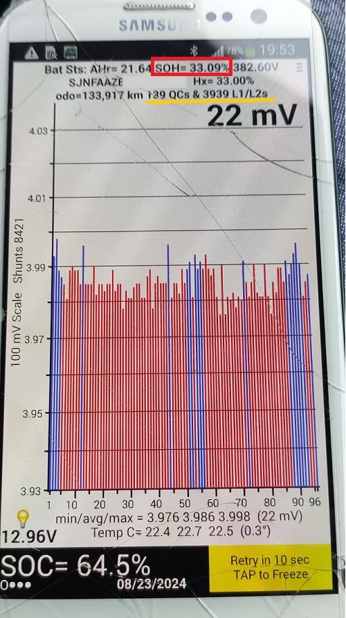 11/2023 - 140.000km (9 Barras-67.86% SOH) --- 02/2024 - 144.757km (8 Barras-65.83% SOH)
