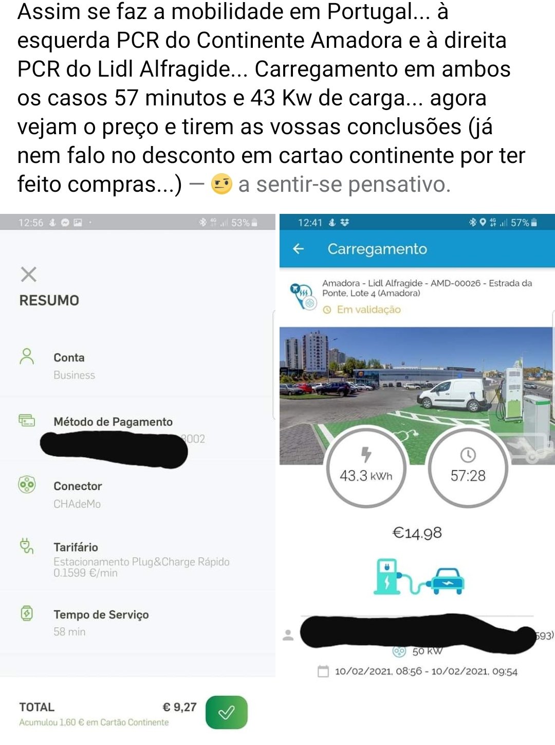 Era suposto o continente ser mais caro? Será que a "culpa" é do Lidl? Valerá mais a pena o Lidl retirar o posto? Serão os 8 ou 10 centimos que os OPC cobram a principal razão para que se atinja uma diferença tão grande no custo do carregamento (desculpa no caso do continente não há carregamento, é só estacionamento).BrunoAlves Escreveu: 13 fev 2021, 17:14 Retirei do FB, como não tem dados acho que não tem problema partilhar.