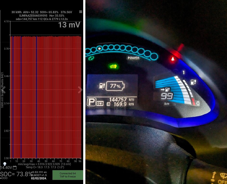 Nunca liguei a minima para o SoH, os valores que são mesmo importantes para ver como estão as celulas serão mesmo a tensão de cada uma e como ela reagem na carga/descarga, era esse tipo de teste que a Nissan devia fazer, mas duvido muito das capacidades dos tecnicos da marca, pela amostra que vi...