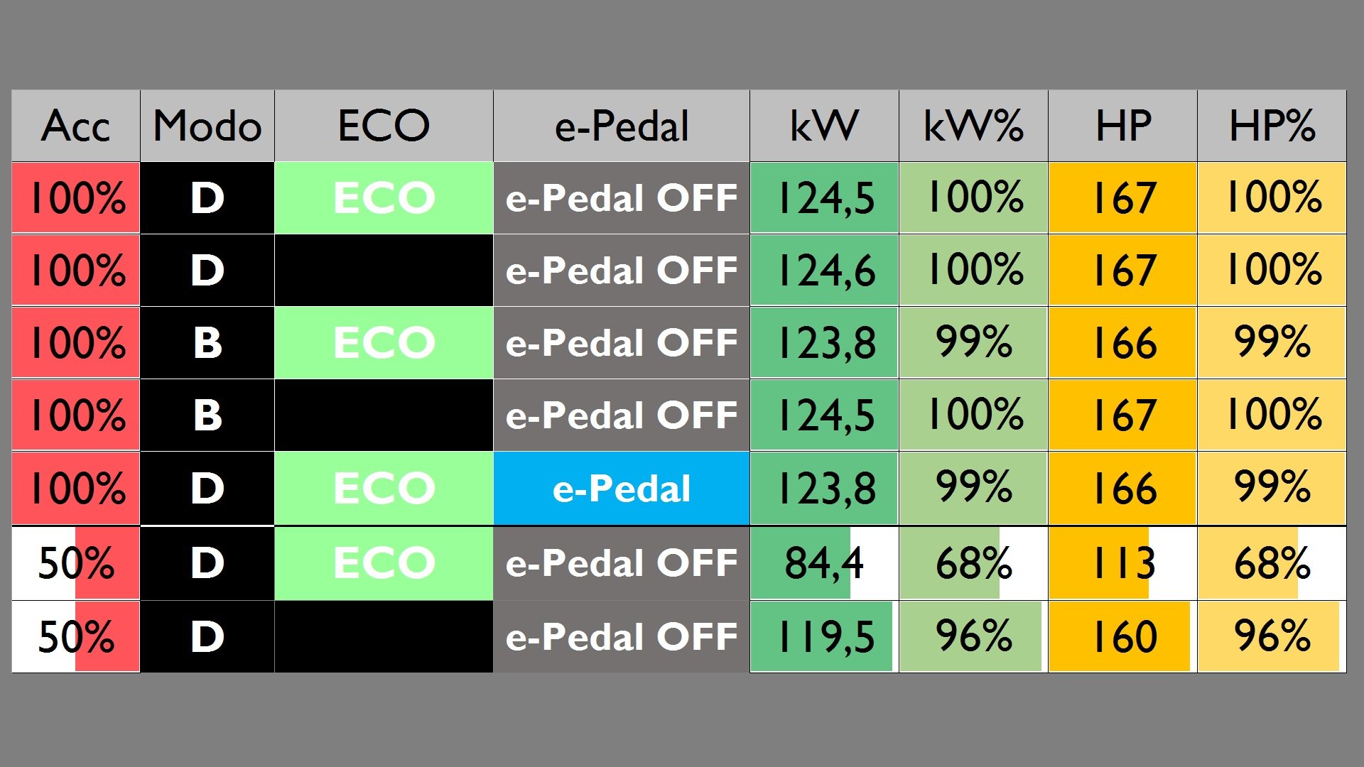 Podes ver na imagem se tiveres o pedal ao que eu chamei de 50% de acelerador (eu sei que é mais, talvez o correto seja 68%) tens 68% da potência.