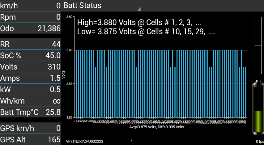 Gosto de acompanhar este DB porque é o inverso do meu, no aspeto que mais me interessa, valor de capacidade. Um de 45.1 contra um de 32.8. Pelos visto a 100km/h faz, em zonas mais planas, 100 km. No meu carro não sei se chegará a completar 80 km, nessas condições. Mas não esquecer outro dado, enquanto que este dá "game over" com as células ainda com mais de 3,6V o meu continua a andar até uma célula tocar nos 2,75V/2,8V. O meu utiliza uma gama maior de SoC, talvez mais uns 5 a 10%. Este também vai ser assim, um dia.