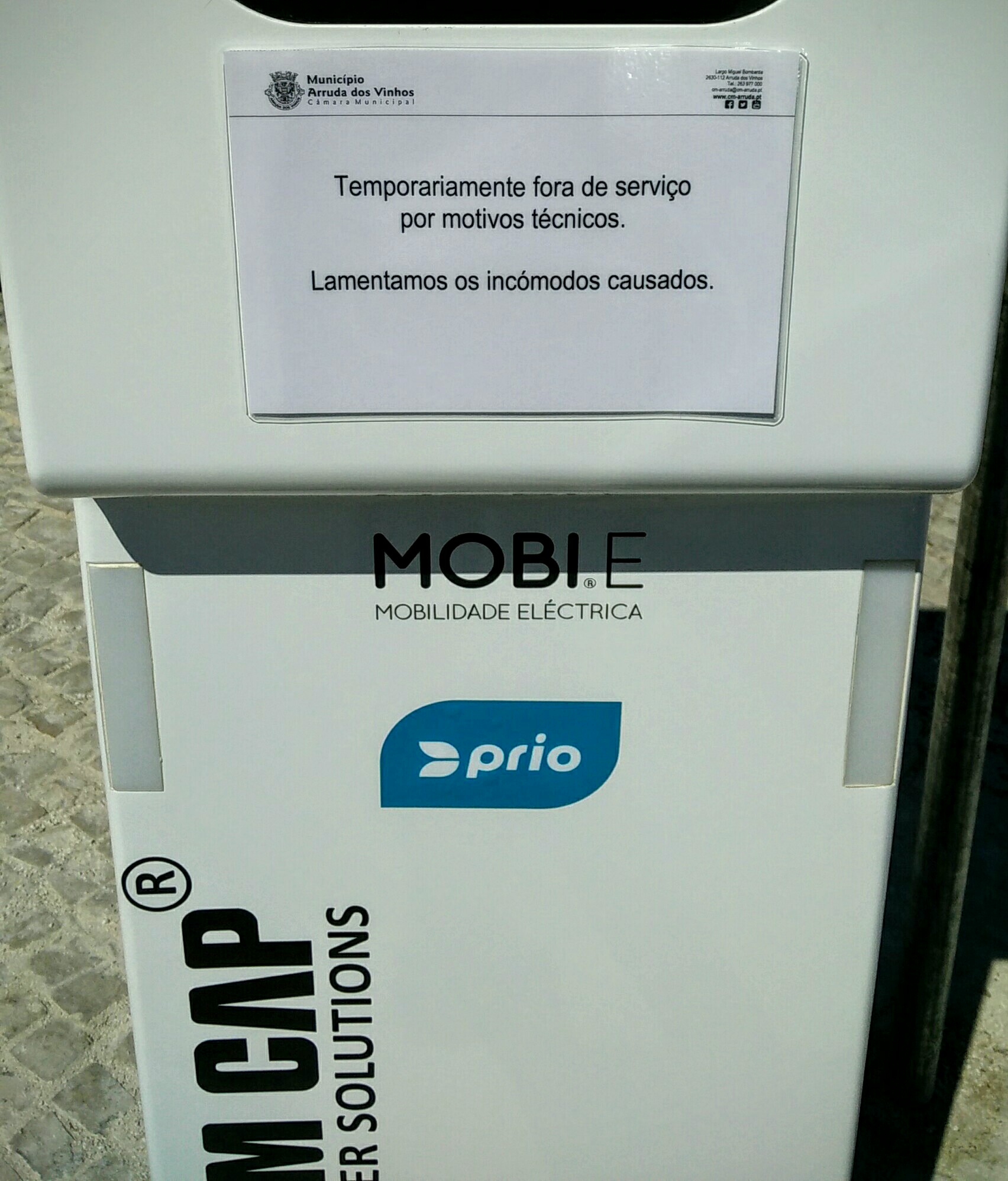 Foi ontem inaugurado um posto de carga de veículo eléctrico em Arruda dos Vinhos. Foi inaugurado e foi desligado: hoje de manhã o referido posto estava desligado. E desligado continua hoje de tarde.