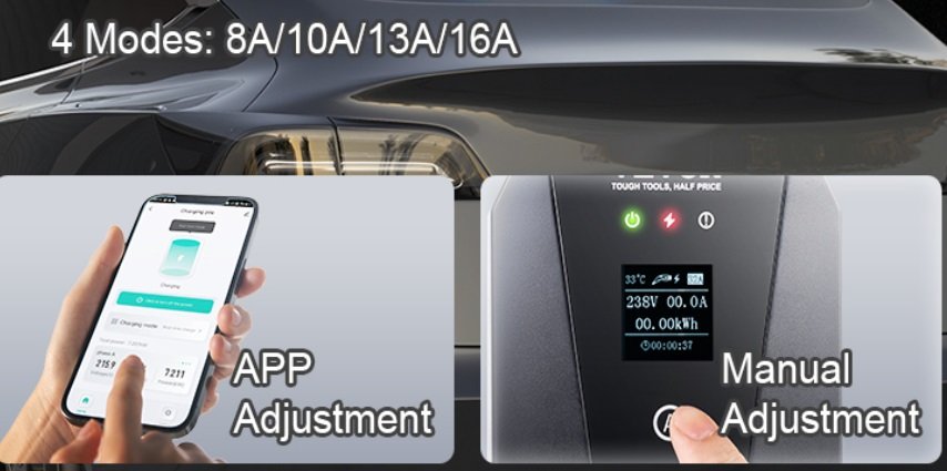 Proteção IP66, com mala de transporte e acessório para prender à parede, ajuste manual no EVSE e via APP, compatível com qualquer carro elétrico ou hibrido plug-in com tomada 2