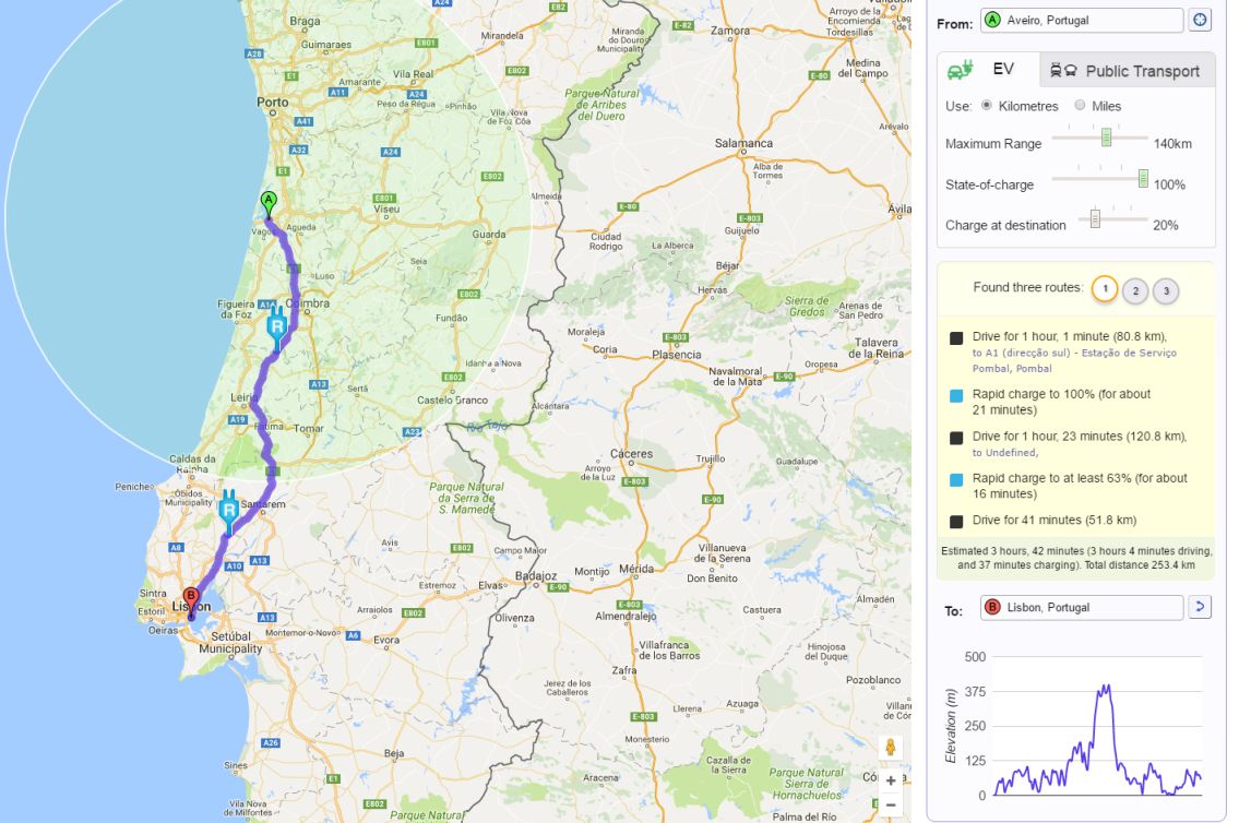 Este já considera (e dá indicação) de pontos de carregamento onde é necessário parar para carregar. Não sei tenho a certeza se a elevação está a ser considerada nas contas da autonomia, mas está interessante.