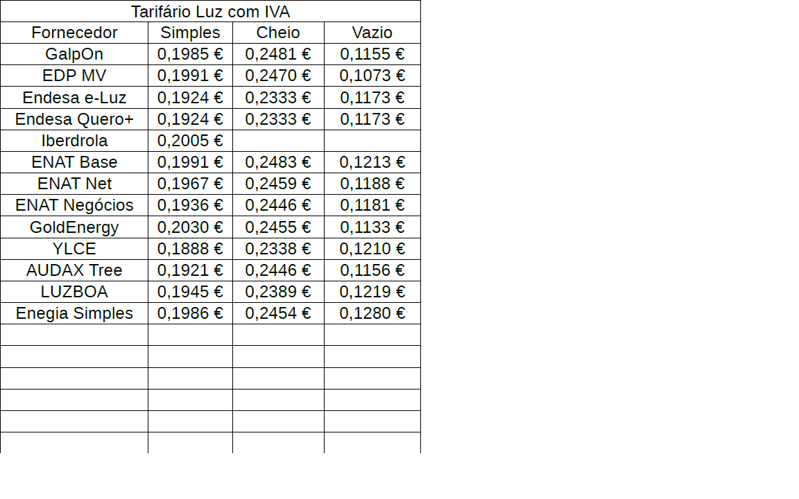 Eu fiz um apanhado das companhias que fornecem Luz cá em Portugal pelo site da ERSE, e já tenho os preços da GalpOn (meu fornecedor), e o preço do vazio da EDP que o @LuisG deu, se alguém for fornecendo os valores aqui eu posso ir preenchendo o quadro e anexar aqui, para quem chegar ver o comercializador que vale mais a pena contratar, e mantinha-se atualizado.