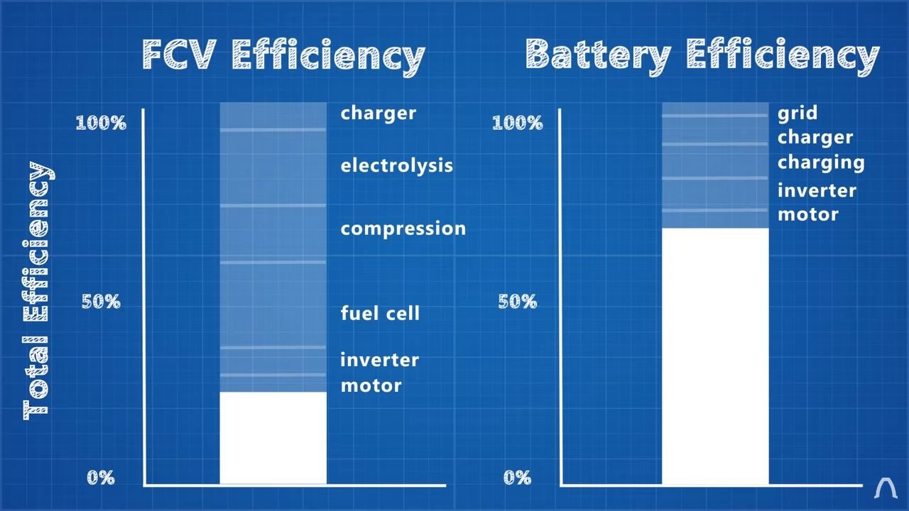 O problema do hidrogénio é a sua baixa eficiência e o seu armazenamento, alem disso tem o problema de que uma fuell cell na melhor das hipóteses tem a duração de uma bateria de lítio, a única coisa onde tem a vantagem é no tempo de abastecimento.