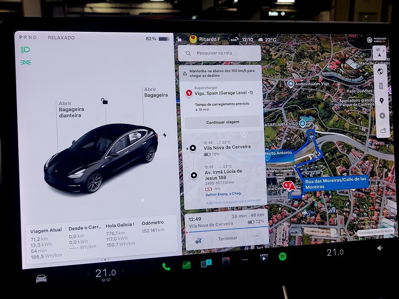 Vamos partir de manhã com 1 rapaz e uma bebé e a primeira paragem programada será em Gaia para almoço, após viagem sem paragens:O "problema" em viagens que obriguem a carregar fora, especialmente em dias acima dos 500 ou 600km onde o tempo ao volante já é algum, acaba por ser conseguir conciliar a localização / desvios / rapidez / tempos mortos com um bom preço, e é por aí onde por vezes alguma coisa tem de ceder.