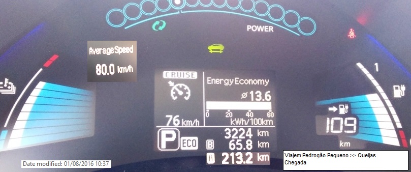 A viajem foi feita em dois troços ( penso não ser possível fazer de uma penada ): Queijas >> Aveiras (carga até 98%) e Aveiras >> PPequeno.