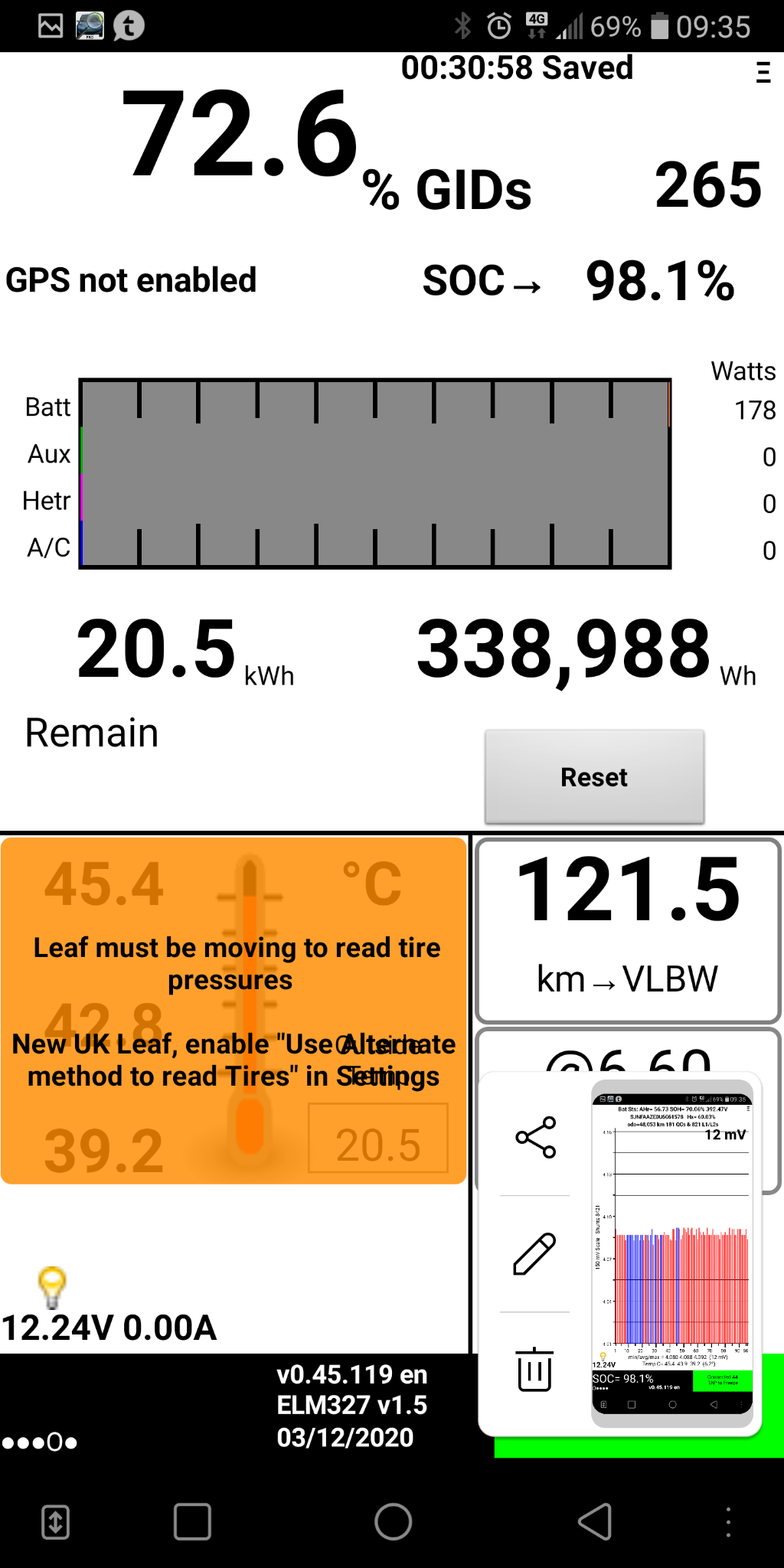 Teste de tomada verdadeiramente dito nunca realizei. Mas já fui dos 8.4% de SOC no leaf Spy até 98.1%. Os kws que aparentemente estão na bateria não são nada animadores.