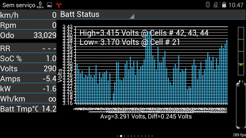 Ora aqui está um screenshot que dá gosto comentar: muito próximo dos 0,0% de SoC, muito próximo dos 2,75V/2,8V na célula mais fraca. Perto de parar, quer pelo parâmetro SoC seja pelo parâmetro voltagem (um carro a avaliar bem a sua capacidade). Muito bom o facto de ter os dois parâmetros concordantes, muitas vezes isso não acontece. Parece também que a discrepância entre a célula mais forte e a célula mais fraca é baixa para esse SoC, outro dado positivo.