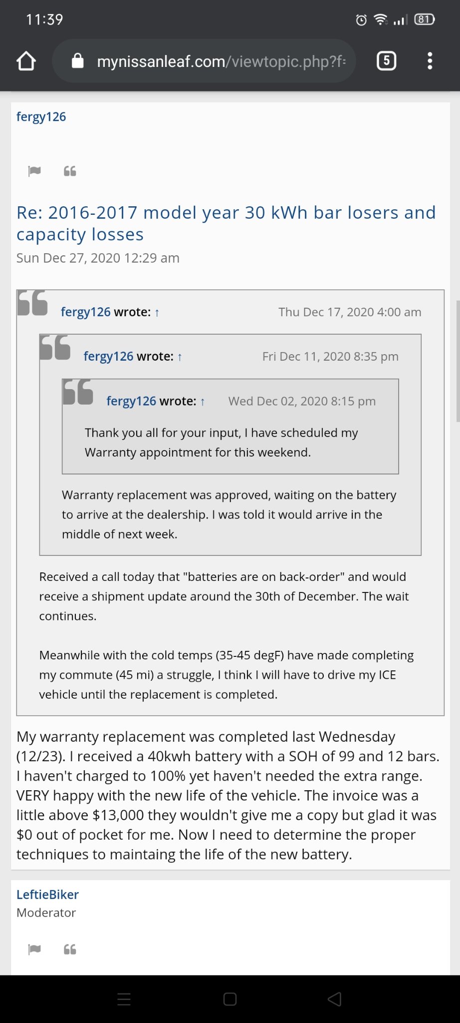 Ainda este mês nos Estados Unidos, mais um testemunho de substituição de bateria 30kwh para 40kwh.papacurvas Escreveu: 27 dez 2020, 11:27X2Nonnus Escreveu: 11 dez 2020, 09:18 Visto o teu caso ser o primeiro que temos conhecimento da possível substituição da bateria num Leaf de 30 em garantia era interessante saber duas coisas.