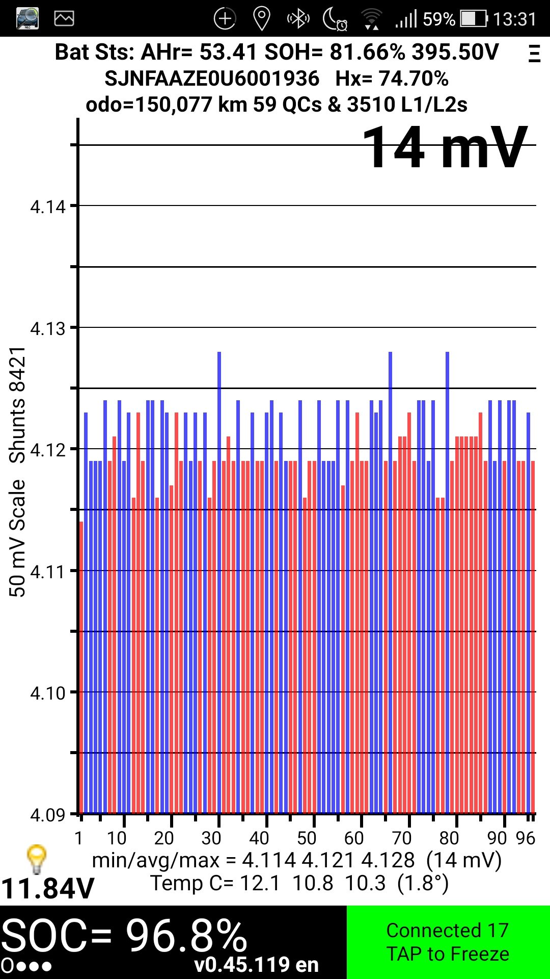 5 anos e meio, 150000km, 11 barras, 53.41AHr, 81.66 SOH. Terá perdido cerca de 20% da autonomia (quando era novo). Mas continuo a fazer bastantes km's com o meu Leaf.