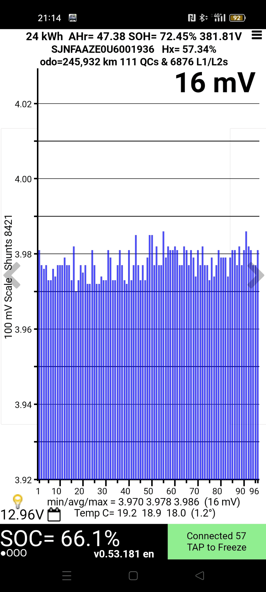 Quase a chegar aos 9 anos de utilização, o carro está com 246000 Km, 72,45%SOH, ronda os 16 Kw com carga a 100%.