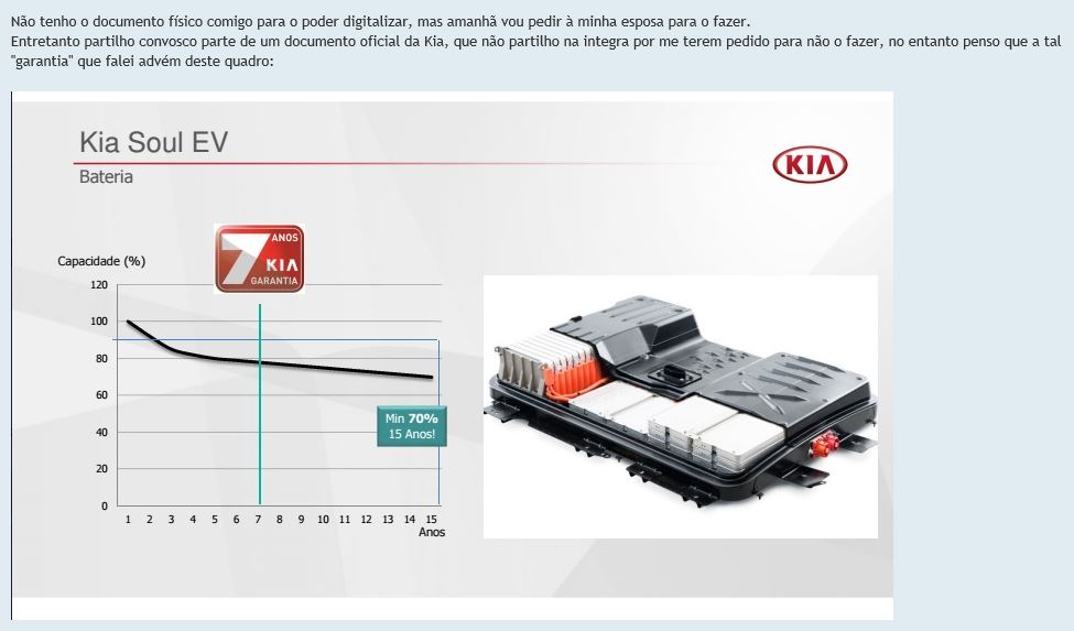 Fora a questão da bateria ser a do Leaf (epic fail da Kia), a imagem parece mostrar 75% de capacidade ao fim de 7 anos e menos de 70% ao fim de 15 anos. Mas não é obviamente uma garantia mas antes uma estimativa (muito otimista...). Há uma diferença muito grande entre garantia de capacidade e capacidade média esperada. Na capacidade média esperada, aproximadamente metade das baterias estarão pior que o apresentado e a outra metade melhor. Isto numa garantia é inaceitável, pois significa que a marca teria que trocar a bateria em metade dos carros. O número de trocas de bateria que a Nissan está a fazer no mundo (muito menos de 10%, diria que pouco mais que 1%) já é, do meu ponto de vista, inaceitável para os encargos com uma garantia. Não consigo conceber a possibilidade de 99% das baterias durarem mais de 15 anos com menos de 25% de degradação. Não conheço baterias assim no mercado.