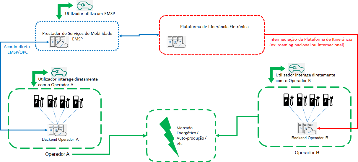 Os Utilizadores poderão interagir directamente com os Operadores ou, alternativamente, através do Prestador (EMSP).