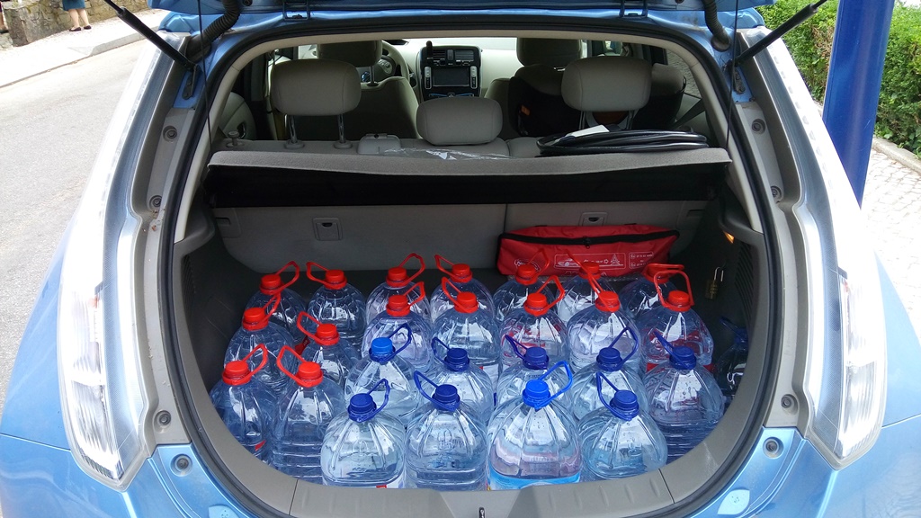 Eu já carreguei 49. Só no espaço das pernas do banco traseiro cabem 12 garrafões de 7l... assim se vê que o Leaf é espaçoso.