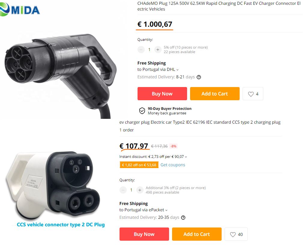 Tentei encontrar a ficha Chademo mais barata que consegui e no entanto cruzei-me com a ficha CCS mais barata que custa :shock: 10 vezes menos.